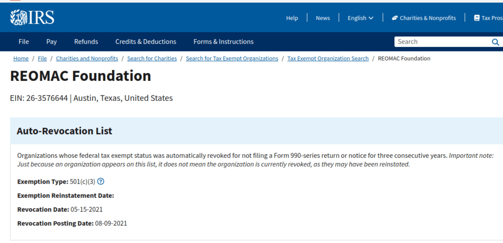 must have missed the Memo as it appears nowhere on their website. We inquired of NADP whether or not they had concerns with NAMFS refusing to release their IRS 990 for public inspection, required by federal law, and they refused to answer which brings yet more questions about the relationship going forward. Building on that, though, is the upside down benefit strategy wherein NADP members may attend NAMFS events for the same price as NAMFS members. The reality is that there is only one event open to NAMFS members per year which is their annual #FraudFest. And as this year’s NAMFS #FraudFest is simply a timeshare sales event put on by Verisk, I am not really looking at that one as a barnstorming event that NADP members will be breaking the doors down to get into. What we do know, though, is that the REOMAC Foundation, which appears on the NADP website, is the same name as that of the REOMAC Foundation which had their 501(c)(3) status revoked by the Internal Revenue Service on 15 May 2021. The name is the same as displayed on the NADP website located here. Once again, NADP was not forthcoming with confirmation about their foundation’s nonprofit status nor the EIN of their foundation.